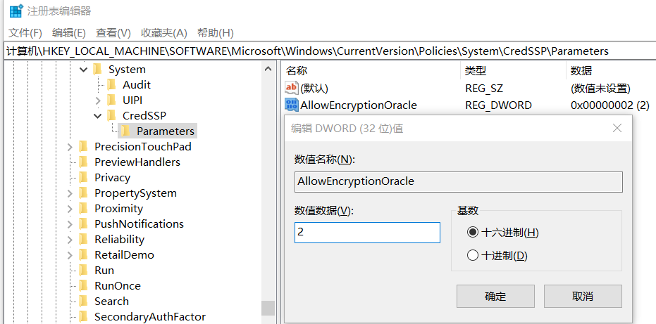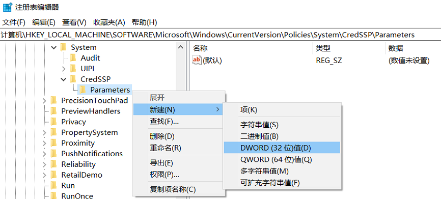 发现里面只有Audit、UIPI,没有CredSSP,所以新建项,重命名为CredSSP,在CredSSP目录下再新建项,重命名为Parameters,目录有了,接着就该新建具体数值了