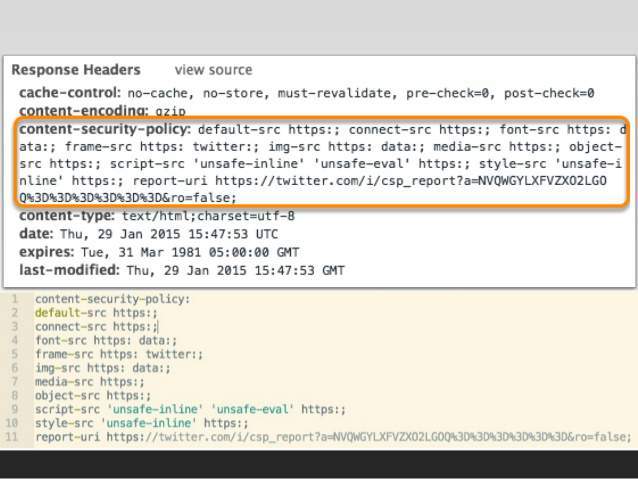 Content-Security-Policy: script-src 'self'; object-src 'none'; style-src cdn.example.org third-party.org; child-src https: