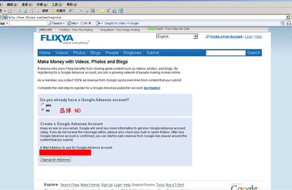如图, 在"Do you already have a Google Adsense account? "这,选择"No"